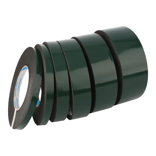 Double sided black foam tape to mount plates, emblems and profiles in the automotive sector. High adhesion. Excellent resistance to UV, weather conditions and ageing. High elongation and conformability.